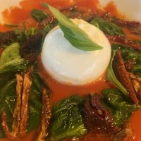 Burrata su specchio di pomodoro con peperoni cruschi e spinaci novelli