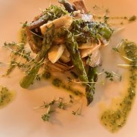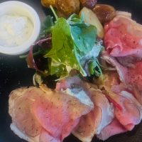 Roast Beef con salsa alle erbe verdi, capperi e olio d'oliva extra vergine, servito con carciofi grigliati e asparagi verdi