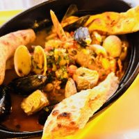 Zuppa di pesce servita con crostini di pizza all'aglio