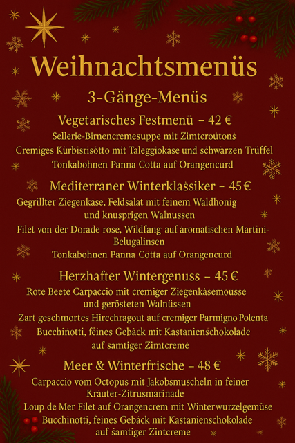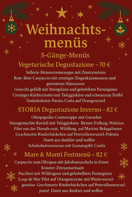 Ristorante STORIA Startseite Reservierung Menü Mittagsmenü Speisekarte Getränke Besondere Anlässe Weihnachtsmenüs Catering & Events Unsere Philosopie Die Fratelli Kontakt Impressum Startseite Reservierung Menü Mittagsmenü Speisekarte Getränke Besondere Anlässe Weihnachtsmenüs Catering & Events Unsere Philosopie Die Fratelli Kontakt Impressum Weihnachtsmenüs Hier Reservieren